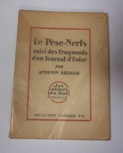 Artaud « Le pèse nerfs ». Suivi des fragments d'un journal en enfer ».Editions Les Cahiers du Sud, 1927, collection « Critique n°3 ». In-12 broché, couverture souple d'édition. 80 pages. Complet du frontispice par André Masson sous...