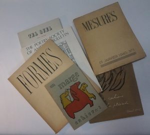 Blanchot, Arland, Benda..) Bon exemplaire. « Tel Quel ». Eté 1967. Texte de Genet, Artaud, Henric, Todorov, Joyce..Bon exemplaire. « Poetry society of america bulletin”. 1979. En anglais. « Formes ». Mars 1930. In-4 broché. Belles reproductions en noir et blanc. Bel exemplaire. « En marge ».Cahier n°2. Sous la direction de Jean Monge. Sans date. In-1 2 illustré.