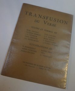 « Transfusion du verbe », La main à plume, Paris 1 941 , in-4 agrafé. 32 pages. E.O. tirage unique à 400 ex. numérotés (1 des 1 80 sur papier hélio : n°116) . Textes et poèmes de N. Arnaud, P. Eluard, J.F. Chabrun, M. Patin, Ch. Dotremont ....