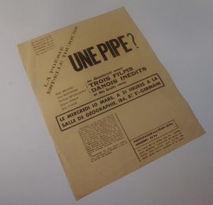 « La poésie est-elle toujours / une pipe », affichette au format in-4. Sans date. Arnaud, Battistini, Dotremont, Kober, Laude en discuteront entre trois films danois inédits et des bruits rares. Parfaite condition