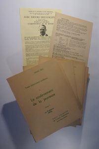 jeunesse, Tome II (CICK, 1971, 200ex) / Le soulèvement de la jeunesse, Tome III (CICK, 1971, 200ex) / Supplément au soulèvement de la jeunesse, Tome I (CICK, 1972, 200ex) / Supplément au soulèvement de la jeunesse, Tome II (CICK, 1972, 200ex), couverture avec rousseurs)/ Complet à l'exception du supplément Tome III, édité en 1986 à moins de 10 exemplaires. Joint : rare bulletin d'information A4 recto-verso avec photographie d'Isou afin de voter pour lui aux Législatives de 1993 et Tract A4 de Maurice Lemaître : Front de la Jeunesse, bulletin d'abonnement, ca.1972 Ensemble très rare malgré le manque signalé