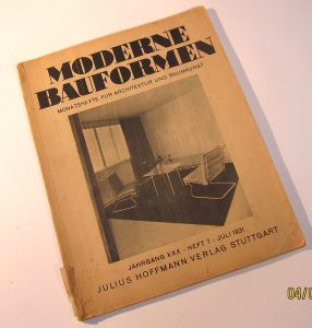 Moderne Bauformen. Stuttgart, juillet 1 931 , revue broché, couverture illustrée en noir. 51 pages. Nombreux textes et illustrations dont la collaboration de Walter Gropius etc .Texte en allemand. Petit manque de papier en pied du dos. (joindre...