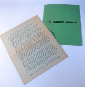 « Support-Surface », catalogue de la première exposition du groupe à l’ARC - Musée d’Art Moderne de la Ville de Paris, 1970. Est joint à l'affiche le « tract vert » ronéoté en feuilles diffusé par Cane, Devade et Dezeuze pendant...