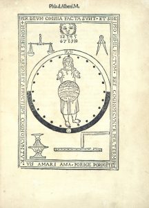 (Andrieux). CIBN, A-165. — Goff, A-297. — GW, n°712. — Hain, n°505. — Pellechet, n°324. — Peddie, Printing at Brescia in the fifteenth century, n°167. Belle et très rare édition incunable de ce livre scientifique, publiée à Brescia par Battista de Farfengo, prêtre et typographe actif dans la ville de 1489 à 1500 environ. Ce dernier, dont on sait peu de choses, en fit paraître une première trois ans plus tôt. Ses impressions sont rares. Imprimée en caractères romains, avec de jolies lettrines sur fond noir, l’édition est particulièrement remarquable pour ses 2 superbes grandes figures gravées sur bois. La première, qui se trouve sur le titre, est une figure allégorique dont le sujet principal montre une femme enfermée dans un cercle qui symbolise le cosmos, bras tendus et paumes ouvertes, et faisant tenir en lévitation à hauteur de son abdomen le globe terrestre. Cette gravure singulière, dont le raccourci des bras est assez bien réussi, apparaît ici pour la première fois. Elle fut copiée pour l’édition vénitienne du même livre en 1496 (cf. Essling, n°894). La seconde gravure montre une tête d’homme vue de profil sur fond noir, avec la représentation des trois ventricules cérébraux. Elle a été copiée sur celle qui orne l’édition parue chez Farfengo en 1490, mais a été rognée d’une vingtaine de millimètres en pied. Outre ces deux figures, l’édition contient encore un diagramme et une figure sur la classification des vents. Notons que le titre courant du feuillet e7 est inversé. Le Philosophia pauperum, initialement publié vers 1480 à Toulouse, renferme divers traités du théologien, philosophe et physicien saint Albert Le Grand (1206-1280) : le Phisicorum, le De celo & mundo, le De elementis, le Methaurorum, et le De anima. Dans cette édition, ceux-ci sont suivis du De regimine principium de Gilles Colonne et le De virtute intellectiva de l’auteur. Superbe exemplaire provenant de la bibliothèque Ruggieri, relié à son emblème (1885, n°430). Suite au lavage de l’exemplaire, les anciennes annotations marginales à la plume sont pratiquement effacées.