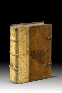 des phylactères portant le prénom Paulus, dos à trois gros nerfs, un fermoir métallique sur deux, tranches lisses (Reliure du xvie siècle). Goff, A-719. — GW, n°1929. — HC, n°5388. — Pellechet, n°3818. — Proctor, n°682. Première édition strasbourgeoise, avec les additions de Girolamo Tornieli, imprimée en caractères gothiques sur deux colonnes. Sortie des presses de Martin Flach, elle sera suivie de trois autres éditions locales en 1491 , 1495 et 1498. La Summa Angelica, ou Somme Angélique, est l’œuvre principale d’Angelo Carletti (c. 1410-1495), dit Angelus de Clavasio, moine franciscain originaire de Chivasso dans le Piémont. Paru pour la première fois, semble-t-il, à Venise en 1476, cet important ouvrage de théologie regroupe et examine tous les péchés imaginables : l’adultère, la calomnie, le concubinage, le maléfice, l’enlèvement des vierges, l’hypocrisie, la simonie, etc. Quelques annotations manuscrites anciennes. Le feuillet 365 est rubriqué, mais fait bien partie de l’exemplaire. Exemplaire bien conservé dans une reliure estampée du XVI siècle. Le titre se lit, un peu effacé, sur la tranche. On a collé, sur le titre et au verso du deuxième feuillet, deux petites vignettes gravées sur bois du XVI siècle représentant Jésus bénissant et le Christ en majesté. Mouillure marginale aux 50 premiers feuillets. Légères rousseurs éparses, trou marginal au feuillet 266. Manque une attache, un mors fendu sur environ 5 cm.