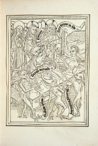tranches dorées (Ateliers Laurenchet). TRÈS BELLE COPIE FIGURÉE ÀL’ENCRE BRUNE ET ROUGE SUR PAPIER VERGÉ ANCIEN, d’une parfaite exécution, d’une édition xylographique publiée en Allemagne rhénane ou dans les Pays-Bas vers 1470. Elle reproduit le titre, sur une ligne, les 13 planches de texte et les 1 1 grandes et remarquables figures montrant un malade alité, dont l’âme est l’enjeu du Bien et du Mal. Il est sollicité par des anges qui lui promettent le paradis : Sis firmus (tiens bon), l’encouragent-ils ; ou dans une autre scène, par des démons ricaneurs qui l’entraînent vers l’enfer : Infernus factus est (il est bon pour l’enfer). Tous concourent au désespoir du pécheur, les uns en rappellant les souvenirs de ses innombrables fautes, les autres en agitant les dernières tentations qui pourraient le précipiter dans les enfers. La marque de l’Atelier à l’Arbre blessé (cf. p.7), avec les initiales g. j. b. et le numéro d’ordre XI, figure sur le dernier feuillet.