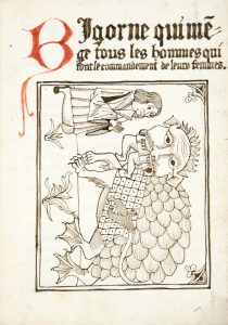 encadrement à froid, petit fleuron aux angles, petite dentelle intérieure dorée, tranches dorées (Ateliers Laurenchet). JOLIE COPIE FIGURÉE, ÉCRITE ÀL’ENCRE BRUNE ET ROUGE SUR PAPIER VERGÉ ANCIEN, établie d’après l’édition imprimée à Lyon vers 1535 (cf. Bechtel, B-195). Elle reproduit sur le titre le bois qui montre un malheureux à genoux devant le monstre qui en dévore un autre. Cette curieuse plaquette gothique est un dialogue entre le monstre Bigorne et un homme faible et maltraité par sa femme. Pour le punir, le monstre décide de le dévorer. La marque de l’Atelier à l’Arbre blessé (cf. p.7) se trouve à la fin, accompagnée des initiales j. b.