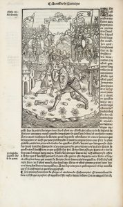 du feu duc de bretaigne Francoys second du nom dernier decede. Faictes et redigees par noble homme et saige maistre Alain bouchard en son Vivant advocat en la court De parlement, et depuis augmentées et continuees Iusques en Lan Mil cinq c ê sxxxi. Paris, [Antoine Couteau pour] Jean Petit et Galliot du Pré, 1 1 septembre 1531. In-folio, veau fauve granité, double filet doré, petit fer aux angles, dos orné (Reliure pastiche moderne). Bechtel, B-274. — Brun, p. 140. — Fairfax Murray, French books, n°56. — La Borderie, Étude bibliographique sur les chroniques de Bretagne d’Alain Bouchart, 1889. — Moreau, IV, n°57. Troisième édition gothique de ces chroniques, qui constituent LE PREMIER LIVRE ÉCRIT EN FRANÇAIS SUR L’HISTOIRE DE LA BRETAGNE. Elles sont l’œuvre du Breton Alain Bouchart (^ avant 1530), qui fut tour à tour notaire, avocat au parlement de Bretagne, puis conseiller et maître des requêtes à l’extraordinaire sous le duc François II. Celui-ci pourrait également avoir commis des actes de piraterie à bord de bateaux guérandais avant sa carrière de magistrat (cf. Étienne Port, « Alain Bouchard, chroniqueur breton », in Annales de Bretagne, t. 36, n°3, 1924, pp. 496- 527). L’ouvrage renferme toute l’histoire de la Bretagne, y compris les légendes les plus fabuleuses. On y trouve des passages sur Charlemagne, Guillaume longue espee, le roi Arthur, Merlin, etc. Sortie des presses d’Antoine Couteau, cette belle édition a été imprimée en lettres bâtardes pour les libraires Jean Petit et Galliot du Pré. Son texte suit celui de l’édition originale de 1514, mais comprend des additions jusqu’à 1531. Le titre, imprimé en rouge et noir avec une initiale L à figure humaine, est entouré d’un encadrement à portique composé de quatre bordures, issu ici du matériel de Jean Petit. L’illustration, également copiée sur celle qui fut spécialement exécutée pour l’édition de 1514, est d’un grand intérêt pour l’iconographie bretonne. Elle se compose de 12 jolies figures gravées sur bois montrant l’auteur à son pupitre, la prise de Rome et l’assaut du Capitole par les Gaulois et les Bretons, une planche représentant treize saints et saintes (dont les sept saints de Bretagne), le combat entre Arthur et le géant Flollo, les grandes armes de Bretagne (répétée une fois), la bataille d’Auray, le duc de Bretagne en son parlement (répétée deux autres fois), les petites armes de Bretagne, et le superbe bois montrant saint Yves en tenue d’ascète (voir ci- contre). Selon La Borderie (p. 11), on trouverait parmi les portraits des saints bretons les plus anciennes images gravées de saint Malo et de saint Corentin. La jolie planche représentant le combat entre Arthur et le géant Flollo sur l’île Notre-Dame de Paris, retrace l’épisode où le héros, à demi-renversé par son adversaire, est sauvé par la Vierge qui recouvre son bouclier d’un pan de son manteau couvert d’hermines. Bouchart nous raconte alors qu’Artur qui navoit veu la vision reprint couraige et se releva, et de son espee nommee Caliburne donna tel coup a Flollo dessus la teste quil luy fendit le front dont il tomba, et de ce coup rendit lesprit sur le champ ; l’auteur poursuit : des lors Artur adverty de la vision print les ermines pour ses armes. Et pour ceste cause les roys et princes de bretaigne ont depuis porte et encores portent en leurs armes les ermines (f. h). La marque typographique de Jean Petit (Renouard, n°891) se trouve au verso du dernier feuillet, sous le colophon. Le bord de quatre feuillets a été replié pour ne pas couper d’anciennes annotations marginales à la plume. Inscription à la plume en bas de quelques feuillets, notamment en N : Vladislaus Siekierka dedit. Un cachet effacé sur le titre. De la bibliothèque C. W. Dysons Perrins, avec son ex-libris armorié gravé (II, 1946, n°341). Accident de tirage au cahier QQ (l’encre a bavé). Titre remonté, quelques feuillets intervertis, salissures et mouillures aux cahiers X à CC. Les cinq derniers feuillets sont restaurés, le dernier par de larges emplâtres de papier au verso. Mouillure marginale à la table.