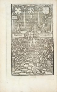 pour] Angers, Charles Debougne et Clément Alexandre, s.d. [janvier 1529 = 1530]. In-folio (322 x 210 mm), maroquin rouge, triple filet doré, dos orné de filets et de fleurons dorés, roulette intérieure, tranches dorées (Reliure de la seconde moitié du xixe siècle). Bechtel, B-354 (type B). — Brun, p. 144. — Moreau, III, n°1663. ÉDITION ORIGINALE DE CES CHRONIQUES D’ANJOU ET Du MAINE, qui couvrent une période allant du Déluge à la fin des années 1520. Elles renferment de nombreuses légendes mais aussi des renseignements intéressants pour l’histoire des guerres d’Italie. L’ouvrage, composé par Jean de Bourdigné (^ 1547), natif d’Angers et chanoine de Saint-Maurice, connut un succès considérable, notamment parce qu’il dépassa de beaucoup l’histoire de ces deux provinces pour embrasser toute l’histoire de France. Comme l’indique le titre, ces chroniques furent revues et additionnees par un anonyme qui se faisait appelé le Viateur. Certains pensent que derrière ce personnage mystérieux se cache le chanoine angevin Jean Pèlerin, dit Viator, auteur d’un admirable traité de perspective, le De artificiali perspectiva (1505), tandis que d’autres supposent qu’il s’agit de Jean Bouchet (^ 1557), poète poitevin qui avait pris pour surnom le Traverseur des voyes perilleuses. Cette dernière attribution paraît plus plausible, notamment parce que Pèlerin décéda avant 1524. Très belle édition imprimée en grosses lettres bâtardes, rehaussée d’initiales ornées sur fond criblé, avec le titre tiré en rouge et noir et placé dans un grand encadrement de forme architecturale provenant du matériel de Galliot du Pré. Au verso du titre, en tête du privilège, figure l’écu de France couronné soutenu par deux anges. L’illustration comprend un beau bois à pleine page montrant l’auteur qui offre son livre à Louise de Savoie, mère de François Ier, entourée de prélats et de barons, et un bois représentant ies Troyens qui édifient ia viiie d’Angers. Le grand bois est dans le style des compositions du peintre lyonnais Jean Perréal. Très bel exemplaire, grand de marges et de second tirage, avec le privilège daté du 3 décembre 1529 et les quelques modifications apportées à l’explicit. Titre un peu pâli. La marque typographique de Galliot du Pré, qui occupe le dernier feuillet, a été découpée puis remontée sur un feuillet blanc. Petite mouillure pâle touchant la marge inférieure des cahiers, la tranche inférieure et le second plat. Réparations à quatre feuillets, traces de salissure sur deux pages.