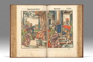 filets se croisant aux angles et roulettes à motifs de rinceaux en encadrement, panneau central orné d’un décor de losanges, dos orné, triple filet intérieur, tranches anciennement dorées et ciselées (G. Huser). Rare édition des commentaires sur l’Évangile du théologien luthérien et réformateur Antonius Cosinus (1501-1553), accompagnée d’une introduction de Martin Luther. Elle est imprimée en caractères gothiques, avec le titre en rouge et noir. Superbe illustration comprenant 75 gravures sur bois à mi-page, signées des initiales MS et HB, avec de nombreuses répétitions et une superbe Passion du Christ de Lucas Cranach, en 15 remarquables figures à pleine page. EXEMPLAIRE EXCEPTIONNEL, RÉGLÉ ET COLORIÉ ÀL’ÉPOQUE. Manque le cahier C ; le dernier feuillet n de la première partie, blanc, n’a pas été conservé. Restauration angulaire au titre et restauration marginale au feuillet R5, avec atteinte aux manchettes.