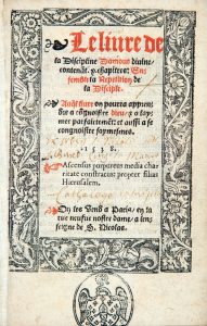 Paris, en la rue neusve nostre dame, alenseigne de S. Nicolas [Pierre Sergent], 1538. In-8, vélin rigide à recouvrement, dos lisse portant le titre à l’encre, tranches dorées (Reliure du xixe siècle). Bechtel, D-261 (titre reproduit). — Moreau, V, n°971. Rare édition de ce traité mystique et ascétique, composé en 1470 par un religieux anonyme du couvent des célestins de Notre-Dame d’Ambert, dans la forêt d’Orléans. L’auteur y propose un enseignement de vie spirituelle, apprend au lecteur comment maîtriser l’orgueil, l’ire, la paresse, l’avarice, et l’informe sur la vanité du monde et la fragilité du corps. Il y montre comment Amour est doux, dévot, patient, larmoyant, profitant, fervent, ardent, élevant, fort, vaillant, triomphant, purifiant, clarifiant, contemplant, mortifiant, languissant, vivifiant, excédant, jubilant, aliénant, gratifiant, glorifiant, déifiant, etc. L’édition a été imprimée par Étienne Caveiller pour plusieurs libraires parisiens : Pierre Sergent, Henri Paquot, Simon de Colines, Jean Longis et Vincent Sertenas. Il s’agit de la troisième édition, après l’originale de 1519 et celle de 1537. Guy Bechtel n’en signale pas d’autres dans sa bibliographie. Impression en lettres bâtardes, à l’exception de la dédicace à Guillaume du Prat, évêque de Clermont, au verso du titre. Le titre est imprimé en rouge et noir et placé dans un encadrement composé de quatre bordures ornées de bêtes fantastiques et de rinceaux sur fond criblé. Avis imprimé au dernier feuillet : Cy finit le livre de la Discipline d’amour divine et de la Répétition de la disciple. Celuy qui la dresse a l’imprimerie requiert a ceulx qui le lir ôt, une souvenance amoureuse devers dieu : pour celuy qui la compose et tous ceulx de la religion : pour une b ône vierge qui a c ômunique lexemplaire, & toutes ses conseurs : et pour luy, & tous ceulx qui lont promeu a estre imprime. Ex-libris manuscrit de l’époque d’un religieux sur le titre. Cachet humide d’un ecclésiastique, répété. Marge intérieure renforcée aux premiers et derniers feuillets. Petite fente sur le premier plat.