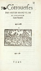 Du Pont (Gratien). C ô troverses des sexes masculin et foemenin. Paris, Pierre Sergent, 1541. In-8, maroquin vert foncé, triple filet doré, dos orné, dentelle intérieure, tranches dorées (Reliure vers 1860). Brun, p. 174. TRÈS RARE ÉDITION de...