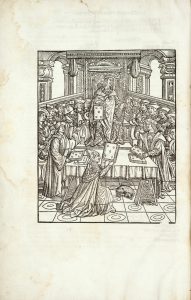 princes [qui] ont regne, & fonde plusieurs villes et citez audit pays, et aultres choses singulieres, et dignes de memoire, advenues dur â tleurs regnes, iusques au duc Philippes de Bourgongne, dernier decede. Paris, Galliot du Pré et François Regnault, 1531 [- 1532]. 3 tomes en un volume in-folio, veau marbré, dos orné, pièce de titre, tranches rouges (Reliure du xviiie siècle). Bechtel, G-392. — Brun, p. 207. — Moreau, IV, n°178 et n°440. — Mortimer, French books, n°268. ÉDITION ORIGINALE DE LA PREMIÈRE CHRONIQUE DE HAINAUT, due à Jacques de Guise, moine franciscain né à Mons et mort à Valenciennes le 6 février 1399. Cette traduction française, version abrégée du manuscrit original latin, est attribuée tantôt à Jacques de Leussach (Lessabée), tantôt à Jean Wauquelin. Cette compilation de textes sur l’histoire du comté de Hainaut, réunie par l’auteur à la fin de sa vie, comprend également des passages sur l’histoire de France, celles des Pays-Bas, de l’Allemagne, ou encore de l’Angleterre. Cette belle publication gothique s’inscrit dans la série des autres chroniques publiées par Galliot du Pré à la même époque : le Miroir histori al et les livres de Jean Froissart. Selon Brigitte Moreau, les deux premiers volumes seraient sortis des presses de Guillaume Bossozel, et le troisième de celles d’Antoine Couteau. Impression sur deux colonnes, agrémentée de nombreuses lettrines à fond criblé. Les titres sont ornés d’un encadrement composé de quatre grosses bordures dessinant un portique, les deux premiers imprimés en rouge et noir, de même que les portraits en médaillon de l’encadrement. L’illustration contient 3 belles figures gravées sur bois, qui se trouvent dans le premier et le dernier tome. La première, répétée une fois et montrant l’auteur en habit d’évêque qui présente son livre à Philippe Le Bon, duc de Bourgogne, est la même que celle utilisée pour l’édition parisienne de 1516 de la Toison d’or de Guillaume Fillastre. Les deux autres bois représentent l’auteur travaillant dans son cabinet, et le roi au Parlement, avec à l’arrière-plan une scène de bataille et un armurier forgeant une pièce. Cette dernière illustration a déjà se^i pour l’édition parisienne de 1520 de la Vie des douze Césars de Suétone. La marque typographique de François Regnault, à l’éléphant, figure à la fin du premier tome, tandis que celle de Galliot du Pré se trouve à la fin du troisième. Exemplaire de premier tirage, où l’on peut lire sur le titre du premier tome Les aultres trois volumes sortiront de bref a lumiere ; effectivement, le quatrième ne vit jamais le jour. Ancienne inscription à l’encre et cachet découpé (comblé) dans le blanc du premier titre. Cachet répété des archives de la paroisse Saint-Nicolas à Avesnes. Grand ex-libris gravé de Maurice Bauchond, avocat à Valenciennes. Taches claires et mouillures à quelques feuillets. Le feuillet f5 du dernier tome est réemmargé. Pièce de titre anciennement renouvelée.