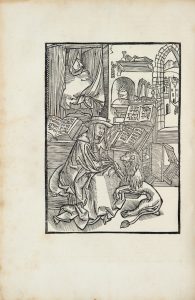 les plats) constituée de cinq roulettes décoratives de fleurs, de pots fleuris et d’arabesques, fermoirs de laiton, dos à quatre doubles nerfs orné de gros fleurons à motifs de fleurs, pièce de titre ocre (Reliure de l’époque). Baudrier, XII, p. 333. — BBA, Gültlingen, I, p. 126, n°75. Belle édition lyonnaise des lettres de saint Jérôme, imprimée en caractères romains par Nicolas de Benedictis pour Jacques Sacon. Selon la liste établie par Gültlingen, il s’agirait du dernier livre de Nicolas de Benedictis, imprimeur qui fut actif à Lyon de 1496 à 1513. Sa marque typographique (Silvestre, n°945) figure à la fin de chaque partie. L’édition se divise en trois parties, chacune en pagination séparée et avec un titre particulier, imprimé en caractères gothiques, et contient un titre supplémentaire entièrement tiré en rouge (f. air°) et disposé sur la page sous la forme d’une pyramide inversée. Le titre général est orné de la grande marque typographique de Jacques Sacon, montrant un portique dans lequel prend place une déesse ailée à la poitrine partiellement dénudée, avec deux cornes d’abondance et qui soutient deux boucliers allongés chargés du monogramme du libraire. Cette marque, de grandes dimensions (210 x 155 mm), semble être une variante de celle reproduite par Baudrier (XII, p. 309) et par Silvestre (n°548) ; le motif de la déesse a été copié sur l’une des quatre grandes figures dues au Maître du Mechior da Parma qui ornent l’Historia continente da l’origine di Milano de Bernardino Corio, parue en 1503 à Milan (cf. reproduction au catalogue Olschki, Choix de livres, IV, 1914, n°4354 et p. 1782). L’illustration renferme un petit bois d’influence vénitienne montrant un clerc dans son cabinet (environ 75 x 60 mm), une lettrine historiée figurant le baptême du Christ (50 x 50 mm), ainsi qu’un remarquable bois à pleine page, répété une fois, copié sur celui d’Albrecht Durer, exécuté pour l’édition bâloise des Epistolae de saint Jérôme, donnée en 1492 par Nicolaus Kessler. Ce beau bois représente saint Jérôme dans son cabinet, ôtant une épine de la patte de son lion ; devant lui, sur des pupitres, sont disposés trois exemplaires de la Bible ouverts sur le premier verset de la Genèse (Au commencement Dieu créa le ciel et la terre), en latin, en grec et en hébreu. SÉDUISANT EXEMPLAIRE DANS SA PREMIÈRE RELIURE. Ancien ex-libris à la plume d’une congrégation religieuse sur le contreplat supérieur. Rousseurs claires éparses, légère mouillure marginale à plusieurs feuillets. Pièce de titre postérieure.