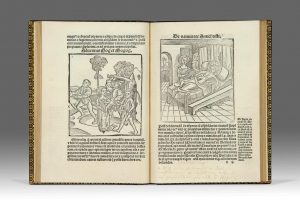 Très belle édition gothique de ce recueil de prophéties attribuées à saint Méthode, évêque d’Olympe et de Tyr, et martyr vers 311-312, avec les commentaires sur les invasions des Turcs par Wolfgang Aytinger, prêtre d’Augsbourg. Elle contient la préface de Sébastien Brandt, parue dans la première édition de Michael Furter, donnée en 1498. Datée du mois de novembre 1497, elle est adressée à Johannes Meder, frère de l’ordre des Franciscains et auteur de sermons fameux sur l’histoire du fils prodigue (Quadragesimale de filio prodigo) (cf. n°31). L’illustration, claire et expressive, est la même dans toutes les éditions imprimées par Michael Furter, qui est aussi la plus belle faite pour ce livre. Elle se compose de 61 remarquables figures gravées sur bois typiquement bâloises, dont celle sur le titre qui représente saint Méthode emprisonné, recevant les révélations de la bouche d’un ange. Les autres gravures montrent des nécromanciens, Adam et Ève chassés du Paradis, Alexandre le Grand et Gog et Magog, des scènes de batailles entre des Assyriens, des Perses, des Grecs et des Romains, etc. La plus curieuse d’entre toutes est certainement celle qui représente la naissance, par césarienne, de l’antéchrist. L’édition princeps de ce livre, parue à Augsbourg en 1496, n’était pas illustrée. UN DES PLUS BEAUX GOTHIQUES ILLUSTRÉS IMPRIMÉS À BÂLE. Cachet Ngl à l’encre bleue dans la marge du titre. Superbe exemplaire, grand de marges. Le tirage des figures est beau. Exemplaire lavé, avec quelques anciennes annotations manuscrites pratiquement effacées. Angle supérieur du feuillet ci restauré.