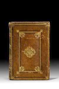 dorés dans les angles, grand fleuron au centre, dos lisse orné, roulette intérieure, tranches mouchetées (Reliure italienne du xviie siècle). Belle édition milanaise des six premiers livres des Fastes d’Ovide, commentée par Antonio Costanzi et Paolo Marso. Imprimée en caractères romains, avec quelques initiales sur fond noir, elle sort des presses de Leonhard Pachel, typographe originaire de Bavière qui fut actif à Milan entre 1500 et 1511 environ. Elle est illustrée d’un beau bois sur la page de titre, représentant Ovide entouré de ses deux commentateurs, avec la marque typographique des Legnano, et de 6 figures sur bois en tête de chacun des six livres, chacune d’entre elles composée de deux ou trois bois différents juxtaposés. L’édition dérive des anciennes éditions vénitiennes, et fut copiée à Paris vers 1512 par Antoine Bonnemère pour Jean Granjon. Ancien ex-libris manuscrit sur le titre, quasiment effacé. Un ex-libris daté 1662 au verso du dernier feuillet. Les sujets dénudés ou indécents, comme par exemple celui montrant un groupe d’hommes urinant (p. 149), anciennement maculés à l’encre, ont été lavés. Mouillure et taches à quelques feuillets, piqûres sur le titre. AGRÉABLE RELIURE ITALIENNE DU XVIIE SIÈCLE. Pour agrandir le format apparent du volume, le relieur a exagéré la taille des chasses inférieure et supérieure. La présence d’une roulette sur celles-ci, et qui n’existe pas sur les chasses latérales, justifie cette interprétation. Gardes renouvelées. Un coin cassé et un autre restauré ; travaux de vers sur les charnières.