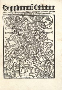 dos orné de filets dorés et de fleurons à froid, roulette intérieure, tranches dorées (J. Faulkner). Livre très rare composé par le moine et orateur réformé Johannes de Paltz (ou Palz) (vers 1445-1511), qui fut le professeur de Luther au couvent des Augustins d’Erfurt, réunissant des sermons sur la rémission des péchés, la sainteté et le salut de l’âme. Comme son titre l’indique, il s’agit d’un complément, ou plutôt d’une seconde partie, au Coelifodine (1502), qui est la traduction latine (vers 1492) du Himmlische Fundgrube (trésor céleste) de l’auteur. L’édition, probablement la seconde, après celle de 1504, est imprimée en caractères gothiques sur deux colonnes, à 38 lignes. Elle est ornée sur le titre d’un superbe bois représentant quatre anges retranchés dans une tour, et se défendant en tirant le canon contre quatre diables armés de hallebardes et de casse-têtes. La petite marque typographique de Martin Landsberg, formée de deux blasons noirs accolés, figure à la fin du volume : elle est légèrement différente de celle qu’il utilisa au début de son activité, reproduite dans le catalogue Fairfax Murray, German books, p. 516. Exemplaire avec quelques initiales rubriquées, relié au XIX siècle par le relieur londonien J. Faulkner, signée de son étiquette. De la bibliothèque Hans Furstenberg, avec son ex-libris gravé. Minimes frottements à la charnière supérieure.