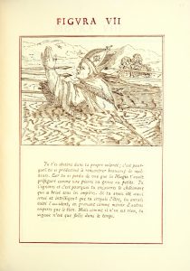 ornée de deux filets et d’une roulette à motifs de rinceaux, dos orné, dentelle intérieure, doublure et gardes de soie noire, tranches dorées, étui (Reliure moderne). Copie manuscrite sur papier à l’encre brune et rouge reproduisant les 32 grandes figures prophétiques de l’édition latine de la Prognosticatio de 1536, accompagnées d’une traduction française inédite du texte latin par Guy Bechtel. Le texte latin est encadré d’un filet de diverses couleurs. Dans cet ouvrage étonnant, l’illustre médecin Théophraste Paracelse (1493-1541) annonça, outre l’effondrement de la papauté, l’arrivée d’une révolution populaire et la fin des régimes monarchiques. Il n’existe aucune édition en français de ces prophéties. La marque de l’Atelier à l’Arbre blessé (cf. p.7) figure à la fin, accompagnée des initiales J.B. et du numéro d’ordre n°4.