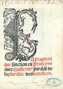 Pragmatique Sanction (La) en Francoys avec Guillerm[us] paraldi de la pluralite des benefices. [Au colophon] : Paris, Gaspard Philippe pour Martin Alexandre, 12 avril 1508. 2 parties en un volume in-8 gothique, veau blond, triple filet doré, dos...