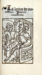 dorée, dos lisse orné, roulettes intérieures, doublure et gardes de tabis bleu, tranches dorées (Reliure de la seconde moitié du xviiie siècle). Bechtel, D-268. TRÈS JOLIE COPIE FIGURÉE SUR VÉLIN, ATTRIBUÉE À FYOT, D’uN RECUEIL DE PIÈCES FACÉTIEUSES. Célèbre et habile calligraphe du temps de Louis XVI, Fyot a parfaitement imité ici l’écriture gothique et su rendre avec beaucoup d’adresse et de goût les 6 bois des éditions qu’il reproduit. Le volume renferme quatre très rares pièces facétieuses en caractères gothiques et un texte léger du début du XVIIe siècle en lettres rondes : - Les dictz de Salomon : Avecques les Resp Oces de Marcon, fort ioyeuses. 15 feuillets non chiffrés. - La grande confrarie des Soulx Douvrer, et engagez de rien faire. Avecques les pardons et statuz d’icelle. [...]. 13 feuillets non chiffrés. - La lettre de cornifflerie. Imprime nouvellement. 5 feuillets non chiffrés. - Prenostication nouvelle de frere Thibault. 4 feuillets non chiffrés. - Compromis, ou contract d’Association, Passé entre-deux-garces de Paris, Qui ont promis et juré L’Une et L’Autre de faire Argent de tout. 1631 . 7 feuillets non chiffrés. Attribués à Salomon et supposés moraux, les Dits sont des tercets plaisants qui mettent en garde contre la guerre, les larrons et surtout les prostituées. CHARMANT MANUSCRIT DANS UNE FINE RELIURE EN MAROQUIN. Il a appartenu successivement à Méon (1803, n°2456), au vicomte Morel-Vindé (1822, n°1808), Duriez (1827, n°2980), au marquis du Roure, qui en donne une longue analyse dans son Analectabiblion (1836, I, pp. 182-185), puis à Charles Nodier (1844, n°572), et a figuré au bulletin Morgand et Fatout (n°10033). Petite restauration à la coiffe de tête et au mors voisin.