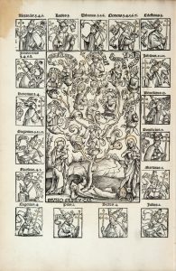 panneau central à compartiments losangés ornés d’un fer carré, restes de renforts métalliques sur les coupes, dos à nerfs orné (Reliure de l’époque). Muther, I, p. 195, n°1285. — Hubert Élie, Les Éditions des Statuts de l’ordre des Chartreux, 1943. ÉDITION PRINCEPS DE CE TRÈS RARE LIVRE CONSACRÉ À LA VIE DE SAINT BRUNO ET ÀL’oRDRE DES CHARTREUX. Elle a été imprimée par les soins de Johannes de Amerbach, l’un des grands imprimeurs de Bâle, à la demande et aux frais des religieux de la chartreuse du Mont Saint-Jean-Baptiste, près de Fribourg. Elle n’a pas été mise en vente dans le commerce et a été distribuée dans les monastères de l’Ordre de plusieurs provinces. Hubert Élie estime que son tirage n’a pas excédé les 300 exemplaires. Belle impression en caractères gothiques, avec un titre particulier imprimé en grandes lettres de forme au début de chaque partie. Remarquable illustration attribuée à l’artiste bâlois Urs Graf, comprenant 5 grandes et jolies compositions gravées sur bois, et 33 petits portraits répétés de papes et d’évêques dans la dernière partie. La figure à pleine page de la première partie est formée de neuf petits sujets avec légendes, représentant des épisodes de la fondation de l’ordre par saint Bruno. La seconde, plus petite, représente l’arbre chronologique des chefs de l’ordre. La troisième montre Guillaume Rainaud en chaire au milieu des Chartreux. La quatrième, à pleine page et fort belle, représente François Dupuis dans la même attitude. La cinquième, enfin, est la même que la seconde mais est ici entourée de dix-sept petits portraits carrés de papes qui avaient accordé des privilèges à l’Ordre. L’ouvrage est un recueil de textes et d’ordonnances sur les statuts et les privilèges accordés à l’Ordre fondé par saint Bruno en 1084. Compilé et publié sur l’ordre de François Dupuis et sous la direction de Georg Reisch, prieur de la chartreuse de Fribourg et auteur de la célèbre Margarita philosophica, il se compose des six parties suivantes : - les Statuta ordinis cartusiensis rédigées par le prieur Guigues Ie 1137). - les Statuta antiqua ordinis cartusiensis. - les Statuta nova ordinis cartusiensis. - la Tertia compilatio statutorum ordinis cartusiensis. - le Repertorium statutorum ordinis cartusiensis. - les Privilegia ordinis cartusiensis. Cette dernière partie sur les privilèges manque souvent dans les exemplaires. Exemplaire grand de marges et rubriqué, conservé dans sa première reliure, absolument complet des six parties. Il est de second tirage, avec la mention sedecim ca 19sc. Ancienne note à la plume sur une garde : Livre très rare que les Chartreux supprimèrent avec un grand soin. Un ex-libris manuscrit gratté sur le titre. De la bibliothèque Paul Helbronner, avec son ex-libris (1987, n°30). Tache claire sur le titre, plus pâle sur le bois du feuillet suivant. Petite mouillure à l’angle supérieur des 100 derniers feuillets. Reliure très restaurée avec une pièce importante sur les plats et le dos. Petites traces de vers sur les contreplats.