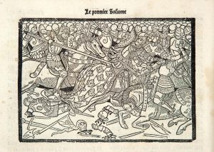 Gadifer, cest ascavoir Regnault, Regnier et Regnesson : lesquelz firent plusieurs beaulx faictz darmes comme pourrez veoir cy apres. Paris, Jean Longis et Vincent Sertenas [au colophon] : Imprimé par Antoine Bonnemere, 14 août 1534. 2 tomes en un volume in-folio, veau brun, filet doré autour des plats, couronne de feuillages dorés au centre, dos orné (Reliure de la fin du xvie siècle). Bechtel, T-62. — Brun, p. 300. — Fairfax Murray, French books, n°536 (avec le Xi en fac-similé). — Moreau, IV, n°1156. ÉDITION ORIGINALE D’UNE INSIGNE RARETÉ. Le roman de Theseus de Cologne, traduction en prose d’une chanson de geste picarde écrite dans la seconde moitié du XIVe siècle, s’inscrit dans un cycle mérovingien autour de la figure du roi Dagobert. Ce récit d’aventures se divise en deux parties. Il raconte les exploits de Theseus, fils de Floridas, roi de Cologne, héros né bossu et miraculeusement transformé en beau garçon, et ses amours avec Flore, fille de l’empereur de Rome. Puis viennent le récit des péripéties de Gadifer, fils de Theseus et de Flore, et celui des aventures des trois fils de Gadifer. Seuls trois manuscrits de cette œuvre épique, rédigés en vers au XVe siècle, nous sont parvenus. Quant aux éditions imprimées, Guy Bechtel n’en recense que deux, la nôtre et celle de Jean Bonfons, vers 1550. L’édition est imprimée en lettres bâtardes sur deux colonnes. Le titre de chaque tome, le premier imprimé en rouge et noir, est placé dans un bel encadrement architectural provenant du matériel de Gilles Gourmont, avec ses initiales E et G ; celui-ci est orné, sur les colonnes, de quatre médaillons contenant les portraits et emblèmes des évangélistes, et, dans les registres supérieur et inférieur, d’une figure du Christ triomphant, des armoiries de la ville de Cologne et du libraire Gourmont, et d’une scène montrant les rois mages présentant des offrandes à la Vierge et à l’enfant Jésus. L’encadrement serait aussi, entre autres, pour l’édition parisienne de 1538 des Nobles malheureux de Boccace (cf. n°70). L’illustration se compose, en dehors de 2 bois différents représentant l’auteur dans son cabinet, de 47 bois gravés, disparates, certains se répétant, dont 2 grands bois spécialement taillés pour cette édition, soit en tout 49 bois. Le premier, représentant deux hommes apportant la statue d’un aigle d’or au roi, illustre l’épisode au cours duquel Theseus se cache dans la statue, pour pouvoir pénétrer en toute discrétion dans la chambre de Flore et lui déclarer son amour. Le second montre un combat entre Calidas, l’orfèvre de l’aigle d’or, et Melchior. Les autres figures sont en partie (ou en totalité) empruntées à une édition d’Ogier le Danois, à la Destruction de Troie (Paris, Bonhomme, 1484), à la Nef de santé (Paris, Veuve Trepperel, vers 1515) ou encore au Livre de Judas Machabeus (Paris, Bonnemere, 1514). Ancien ex-libris à l’encre sur le titre. Ex-libris armorié avec les initiales D et P. De la bibliothèque Albert Natural, avec son ex-libris (1987, n°140). Manquent les feuillets ni et Yi, remplacés par des fac-similés, le dernier ne se raccordant pas exactement à quelques lignes près au texte de l’édition. Fond des premiers et des derniers feuillets renforcé. Restauration marginale à une quinzaine de feuillets, avec perte de lettres au feuillet a2 et le titre courant de certaines pages coupé. Deux taches d’encre brune affectant le papier aux feuillets L et L, avec perte de quelques lettres. Trous de ver en marge de plusieurs cahiers. Reliure restaurée.