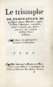 [Triomphe De Dame Vérolle]. Le Triumphe de treshaulte et puissante dame, Verolle, royne du Puy d'Amours : nouvellement compose par L'inventeur de menus plaisirs honnestes. Avec le pourpoint fermant aboutons. Paris, Alain Lotrian, 1540. Manuscrit sur...