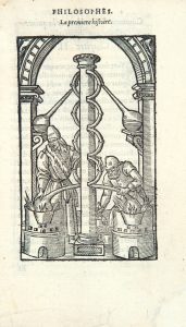 rouge et noire, roulette intérieure, tranches dorées (E. Niédrée). Caillet, III, n°10915. — Dorbon, n°4991 (pour l’édition française de 1550). — Ferguson, II, p. 482. Seconde édition de la traduction française de l’un des plus importants traités d’alchimie touchant à l’art de la distillation. Elle est ornée de 52 figures gravées sur bois représentant des fourneaux philosophiques, des cornues, des athanors et d’autres ustensiles employés par les alchimistes. Originaire de Nuremberg, le médecin Philippe Ulstadt exerça à Fribourg en Suisse. Il composa cet ouvrage en s’appuyant sur des travaux d’Arnaud de Villeneuve, Albert Le Grand, Raymond Lulle, Marsile Ficin, etc., et le fit d’abord paraître en 1525 sous le titre Coelum philosophorum. Il y décrit notamment la distillation circulatoire, fort en usage au XVe siècle, loue les propriétés de l’or potable et celles de l’eau-de-vie, et donne la recette d’une liqueur appelée eau-de-vie de l’Empereur Frédéric troisième, qui était fort appréciée des gourmets du Moyen Âge. Le traité d’Ulstadt connut un grand succès et toutes ses éditions sont rares. Bel exemplaire, malgré une restauration angulaire à un feuillet liminaire et un petit travail de vers sur la charnière supérieure. De la bibliothèque du libraire Techner (1865, n°62). Ex-libris gravé du XIXe siècle d’E. Frick, étudiant en médecine.