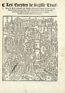 triple filet à froid, dos à cinq nerfs orné de caissons à froid, dentelle intérieure dorée, tranches dorées (M. Godillot). Bechtel, V-358 (avec reproduction du titre). — Moreau, IV, n°545. Rare édition gothique des œuvres complètes de Virgile, comprenant la traduction française des Bucoliques et des Géorgiques par Guillaume Michel, dit de Tours, parue précédemment à Paris en 1516 et 1519, et celle de L’Énéide par Octavien de Saint-Gelais, déjà parue en 1509. Il s’agit d’une copie frauduleuse, sous le nom de Jacques Le Messier, de la première édition collective française donnée à Paris en 1529. Le matériel employé ici n’est pas celui de Le Messier, qui ne publiait plus depuis dix ans, mais principalement celui de Nicolas Couteau ; quelques lettrines proviennent du matériel d’Antoine de La Barre. L’édition est imprimée en lettres bâtardes sur deux colonnes, avec les commentaires latins en caractères romains disposés dans les marges. Le volume se divise en deux parties et s’ouvre par un titre en rouge et noir, avec une initiale L grotesque, placé dans un joli encadrement gravé sur bois daté 1519 et provenant du matériel de Pierre Vidoue. La seconde partie, en pagination séparée, possède un titre particulier intitulé Les Eneydes. L’illustration, archaïque et foisonnante, se compose de 2 grands bois, l’un au verso du titre général représentant une ville en flammes, l’autre montrant le siège d’une cité et apposé sur le second titre, et 162 petits bois dans le texte, dont certains se répètent. Le grand bois qui orne le deuxième titre avait déjà été utilisé pour la seconde édition française de Tite-Live, publiée à Paris en 1515 (cf. Fairfax Murray, French books, n°319, reproduction p. 403). Exemplaire élégamment relié par Godillot, le bord des contreplats décoré d’une dentelle ornée d’animaux et de scènes variées. Deux ex-libris manuscrits apposés sur le titre, dont un contemporain de l’édition. De la bibliothèque Richard de Loménie, avec son ex-libris gravé par Bouvier. Quelques taches d’encre brune aux feuillets N3v° et N4 ; déchirure en tête des feuillets ee1 et kk6, et en pied du feuillet nn (réparée). Petites restaurations au verso des marges du titre. Le second feuillet, plus court, provient d’un autre exemplaire. Mouillure claire à quelques feuillets. Petite éraflure sur le second plat.