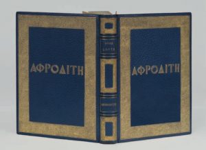 LOUŸS (Pierre). Aphrodite. Mœurs antiques. Paris, Ferroud, 1909. In-8, maroquin bleu, titre en grec en lettres perlées dorées, large encadrement dans le même goût, dos orné, contreplats orné de deux encadrements dorés, gardes de