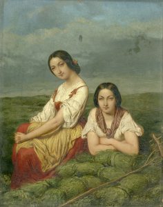Julien Vallou de Villeneuve (Boissy-Saint-Léger 1795-Paris 1866) Deux jeunes paysannes au repos Vers 1 840 Huile sur panneau 33,3 x 26,5 cm Signé Vallou dans le coin inférieur droit Encadré Note : Peintre et lithographe fécond, Vallou de...