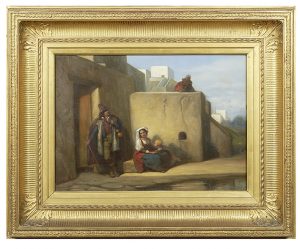 Henri Le Secq (Paris 1818-1882) Famille italienne au repos dans une architecture Huile sur panneau Vers 1845 31 x 43 cm Signé « H. LE SECQ » en rouge dans le coin inférieur gauche, empreinte en creux « Tachet Breveté à Paris » au dos du...