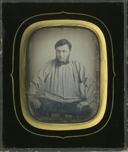 Photographe non identifié Autoportrait en blouse Daguerréotype quart-de-plaque Vers 1 850 A vue 9,3 x 7 cm Note : Le modèle porte la blouse caractéristique des photographes pendant leurs opérations au laboratoire