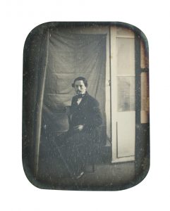 Photographe non identifié Homme assis dans la lumière d'une porte-fenêtre Daguerréotype quart de plaque Vers 1850 9 x 7 cm (à vue)