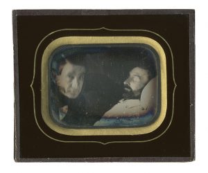 Louis Dodero (Marseille) Vanité. Un homme post-mortem, un autre fixant l'objectif du photographe Daguerréotype quart-de-plaque Vers 1850 A vue 6,7 x 8,7 cm Étiquette du photographe au dos Provenance : Collection Paul Benarroche Vente Paris...
