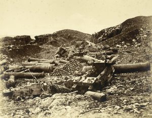 Léon Mehedin (L’Aigle 1828-Bonsecours 1905) Pièces brisées dans la Redoute Korniloff 1855 Épreuve sur papier salé-albuminisé d'après un négatif papier 25,1 x 32,3 cm Signature manuscrite à l'encre en bas à gauche, titre manuscrit à...