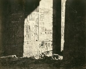 montage Tirage privé, différent de ceux de Hubert de Fonteny Léger enfoncement non restauré dans le haut de l'épreuve Littérature : Collectif. Félix Teynard. Calotypes of Egypt, reproduction page 51 Aubenas/Roubert. Primitifs de la photographie. Le calotype en France, reproduction page 244 Note : Cette épreuve d'un tirage différend de ceux de l'imprimerie photographique de Fonteny d'où sortent les épreuves connues, accentue les contrastes pour mettre l'accent sur l'inscription, repoussant son environnement dans l'ombre