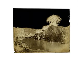 Louis de Clercq (Paris 1836-Oignies 1901) Rocher surplombant une rivière dans le Sud-Ouest de la France Vers 1 860 Négatif papier ciré (calotype) 24,3 x 31,7 cm (la vue), 25,8 x 32,5 (la feuille) Le ciel entièrement masqué à l'encre de chine...