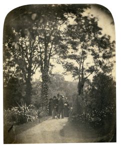 Édouard Delessert (Paris 1828-1898) [attribué à] Jardin de Paul Gavarni à Auteuil (Paris), quatre personnes dont son fils Pierre et lui-même de dos Vers 1860 Épreuve sur papier albuminé d'après un négatif verre 24 x 19,5 cm, les deux coins...