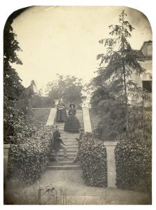 Édouard Delessert (Paris 1828-1898) [attribué à] Propriété de Paul Gavarni à Auteuil (Paris), quatre personnes posant sur un escalier, dont son fils Pierre Vers 1860 Épreuve sur papier albuminé d'après un négatif verre 24,3 x 18,1 cm, les...