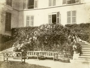 Édouard Delessert (Paris 1828-1898) Passy Bancs devant le double escalier de la maison familiale (Paris) Vers 1 855 Épreuve sur papier salé d'après un négatif papier 1 8,8 x 24,9 cm Légende manuscrite à l'encre sur le montage