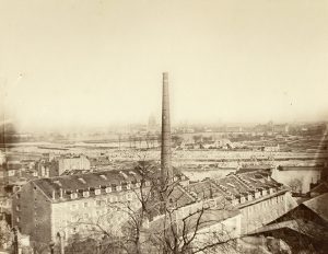 Édouard Delessert (Paris 1828-1898) Passy, vue plongeante sur la raffinerie, au fond la Seine, l'École Militaire (Paris) 1859 Épreuve sur papier albuminé d'après un négatif papier 19,4 x 25,1 cm Légende manuscrite à l'encre sur le montage «...