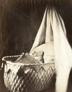 André Adolphe Eugène Disderi (Paris 1819-1889) Décès 1858 Bébé dans un berceau, portrait post-mortem 1858 Épreuve non montée, sur papier albuminé d'après un négatif verre 23,9 x 18,8 cm Légende manuscrite et numéro 6887 au crayon au dos...
