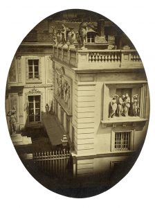 Ambroise Richebourg (Paris 1810-1875) Vue plongeante sur un hôtel particulier Vers 1855 Épreuve sur papier salé-albuminisé d'après un négatif verre 22 x 17 cm, ovale Timbre sec du photographe sur le montage