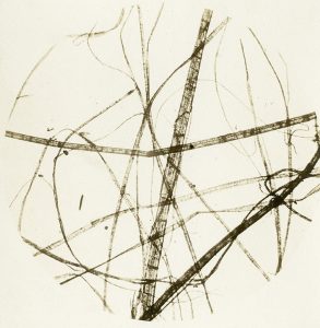 Auguste Bertsch (Paris 1813-1870 ou 1871) Filaments de Chanvre Microphotographie 1854 Épreuve sur papier salé d'après un négatif verre Diamètre 13,8 cm (la vue), 14,7 x 14,5 cm (l'épreuve) Légende manuscrite en bas sur le montage, et numéro...