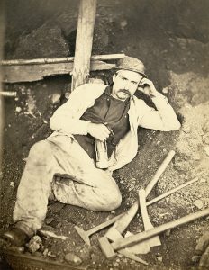 Photographe non identifié Mineur au repos Vers 1860 Épreuve sur papier albuminé d'après un négatif verre 27 x 21 cm Notes : Ce portrait de mineur, feint ou véritable, est le prétexte à un jeu de géométrie angulaire Seule épreuve connue