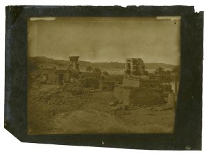de Blanquart-Evrard pour comparaison Littérature : Dewitz/Scholler-Procopovici. Die reise zum Nil, reproduction page 1 56 Collectif. Maxime Du Camp en Égypte Notes : Les seuls autres exemples de tels tirages (avec marges), se trouvent dans les collections de l'Ardi à Caen, provenant du colonel Jean-Charles Langlois que Du Camp rencontra en Égypte. A l'occasion de la publication du fonds de ces épreuves et de l'étude les accompagnant, l'hypothèse de tirages effectués sur place par Du Camp en fit les premiers, précédant ainsi ceux qu'Alfred Nicolas Normand réalisa à Rome lors du retour en France du littérateur en 1851 . Si l'on compare cette épreuve avec une autre issue des ateliers de Blanquart-Evrard, on constatera (outre une teinte sans commune mesure) une grande différence de taille ; les quatre côtés se trouvent en effet « rognés » dans la production lilloise, alors que pour cette épreuve de « tirage privé » on se trouve face au pur contact d'après l'entier négatif calotype. Le coin abattu dans l'angle inférieur gauche est un moyen de repérer facilement le côté sensibilisé du papier positif quand on se trouve dans l'obscurité du laboratoire Seule épreuve de ce type connue