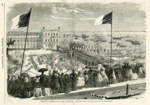 Littérature : La Lumière, 3 juillet 1858, page 106 Notes : Le roi du Portugal, Pedro V, qui a épousé la princesse par procuration, le mois précédent, la reçoit devant une foule en liesse. Ternande missionné à Lisbonne par un journal illustré, réalise à cette occasion quelques images instantanées parmi les premières du genre. Une gravure d'interprétation d'après cette photographie a été publiée dans l'Illustration du 5 juin 1858