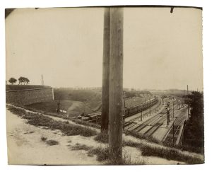 : Aubenas/Le Gall. Atget une rétrospective, reproduction page 216 [Porte de Bercy. Sortie de Paris du P.L.M. Boulevard Poniatowski] Badger. Eugène Atget, reproduction s.p. Beaumont-Maillet. Atget Paris, reproduction page 618 [Voies de chemin de fer, boulevard Poniatowski] Note : On remarque une partition de l'image en deux moitiés comme très souvent dans ses photographies de pure création ; ici les poteaux délimitent d'un côté la ville ancienne enfermée dans ses fortifications, de l'autre les voies multiples qui permettent d'y entrer ou d'en sortir grâce au chemin de fer, produit de la modernité