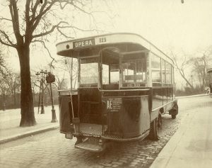 Eugène Atget (Libourne 1857-Paris 1927) Autobus de la ligne A E Opéra. Paris (dos) Vers 1920 Épreuve non montée, sur papier albuminé d'après un négatif verre 17,6 x 22 cm (la vue), 18,1 x 22 cm (l'épreuve) Note : A la différence du numéro...